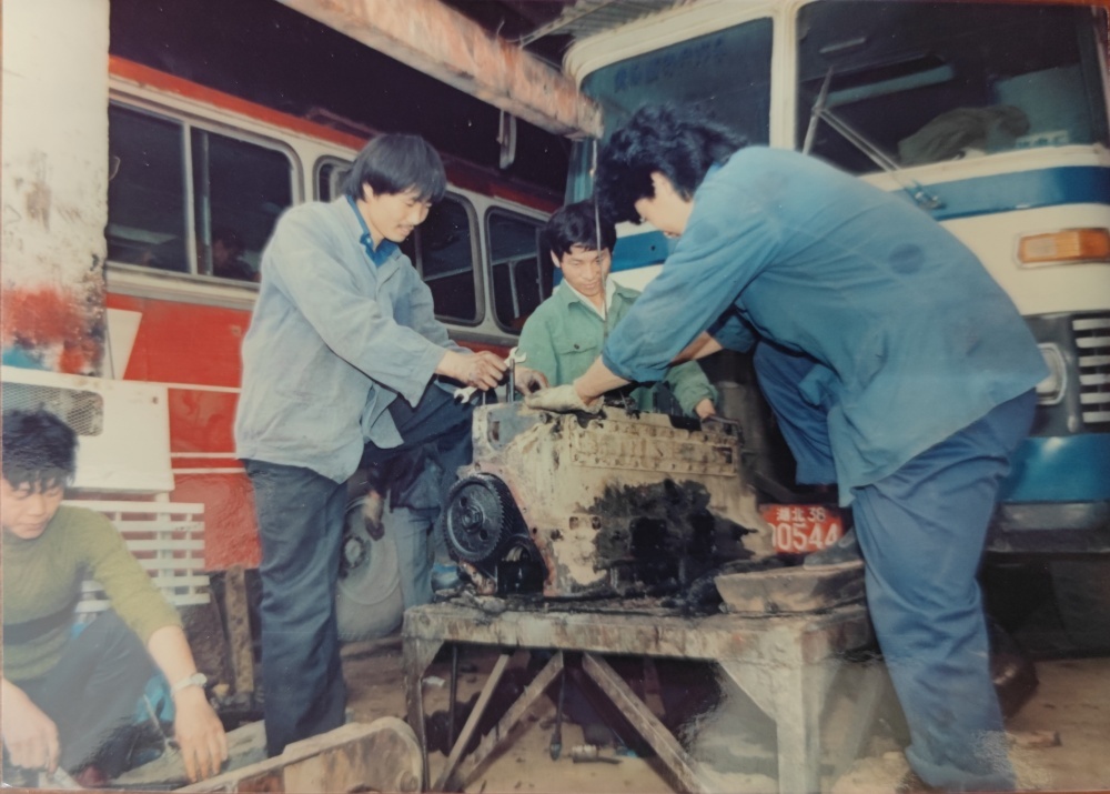 ▲80年代,車間修理工檢修模樣。3個(gè)機(jī)修工一同修理著車輛發(fā)動(dòng)機(jī),臉上沒有吃力感,更像是帶著興趣在專研。