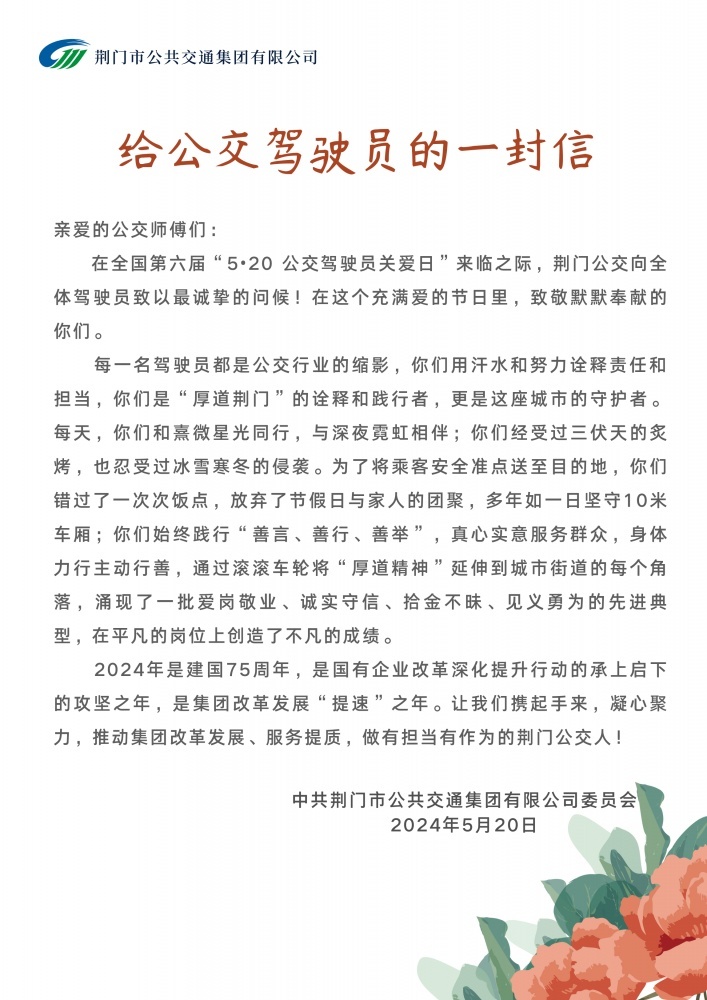為倡導(dǎo)社會(huì)關(guān)愛公交駕駛員,營(yíng)造理解、尊重公交駕駛員的良好氛圍,5月20日,市公交集團(tuán)以“全國(guó)公交駕駛員關(guān)愛日”為契機(jī),通過(guò)一系列關(guān)愛駕駛員的活動(dòng),為公交駕駛員們送上節(jié)日祝福和關(guān)愛。