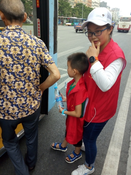 15時許,志愿者們已經(jīng)布置好了送水點,將箱礦泉水擺在了站臺旁邊。每有一輛公交車進站??浚驹刚邆兌紩o駕駛員們遞上兩瓶礦泉水,還有一些放暑假的小朋友們,也熱情的加入到此次活動,充當著志愿主力軍,用他們的行動清涼了公交駕駛員的心,傳播著社會正能量。