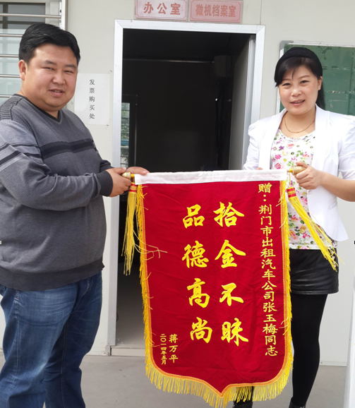 5月4日,乘客蔣女士從市出租汽車公司領(lǐng)回丟失的蘋果iphone5s手機,感動萬分,并送上印有“拾金不昧品德高尚”錦旗,以表達對的姐張玉梅的謝意。